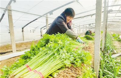 村民在大棚里整理收獲的芹菜。記者 焦海洋 攝