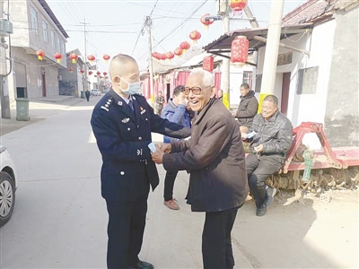 2月11日(大年三十),全國公安楷模、臨潁縣公安局皇帝廟派出所指導(dǎo)員、駐村民警兼大袁村黨支部副書記陳曉磐早早來到大袁警務(wù)室,與藏學(xué)亮、何帥等新時代警務(wù)志愿服務(wù)隊隊員一起,為轄區(qū)優(yōu)秀老黨員、優(yōu)秀退役軍人、警務(wù)室身邊好人、治安積極分子等送紅包賀新春。這是他們每年春節(jié)堅持開展的活動。