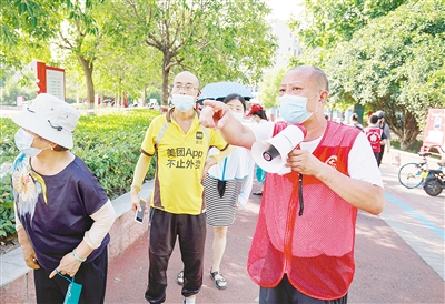 “大家排好隊,十人一組,不要著急。”8月7日,在開來怡景小區(qū)旁的核酸檢測采樣點(diǎn),開來怡景小區(qū)業(yè)委會主任張曉伍幫忙維持現(xiàn)場秩序。從早上9點(diǎn)忙到晚上10點(diǎn),他的嗓子啞得說不出來話。