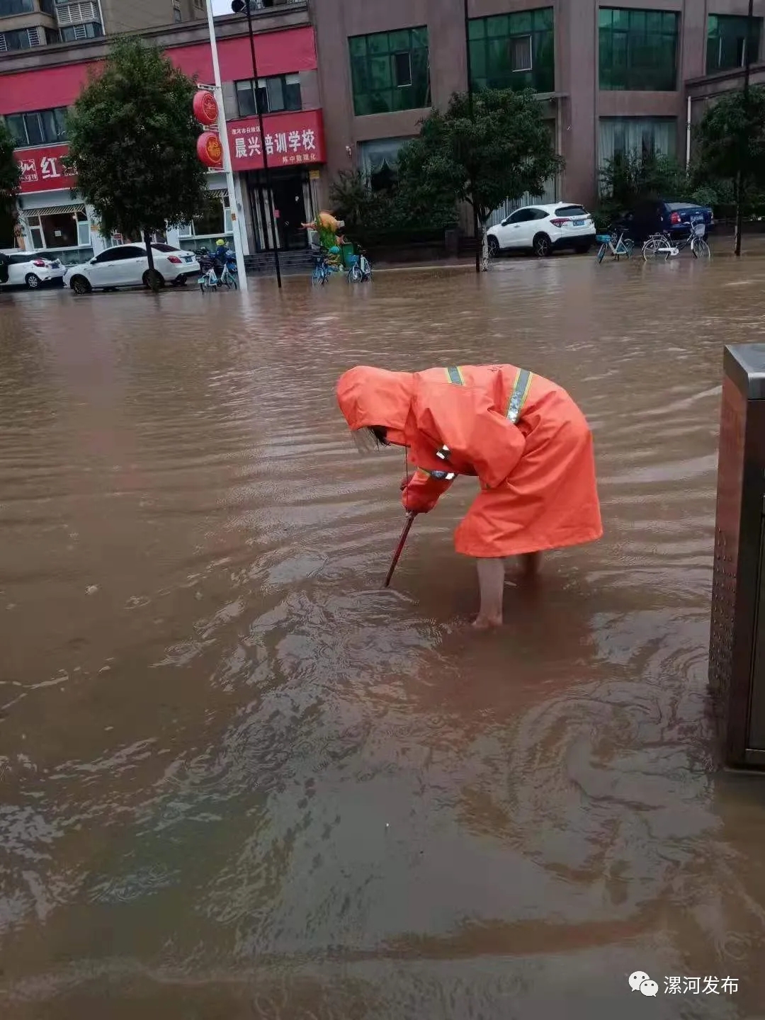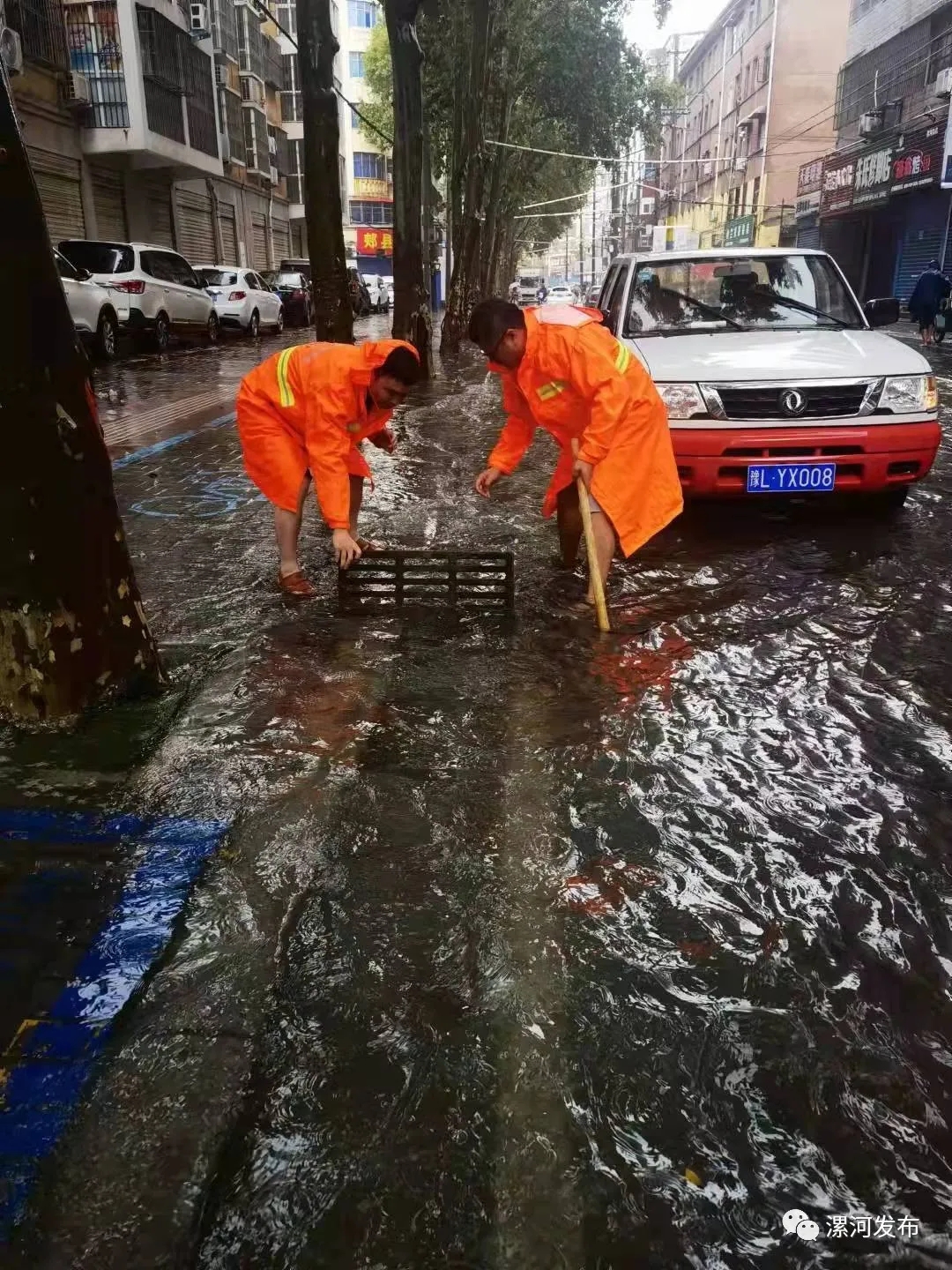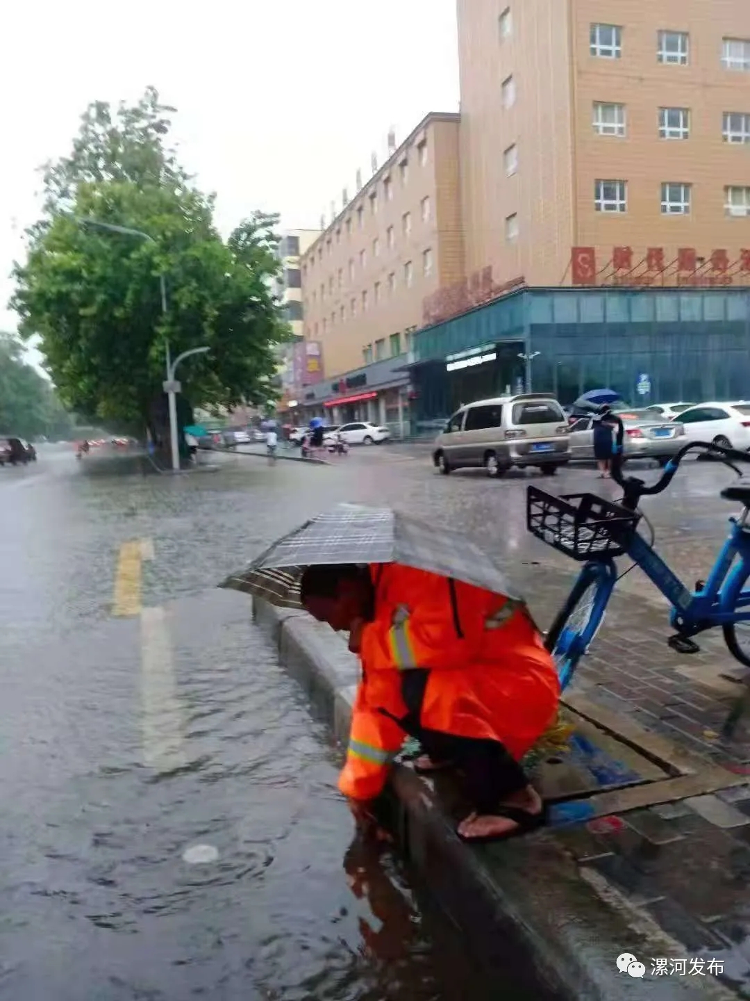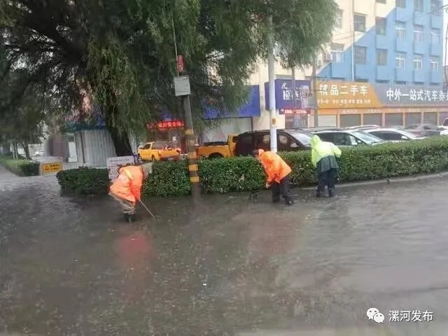 解放路北段,工作人員清理窨井篦子雜物,加速積水排放!