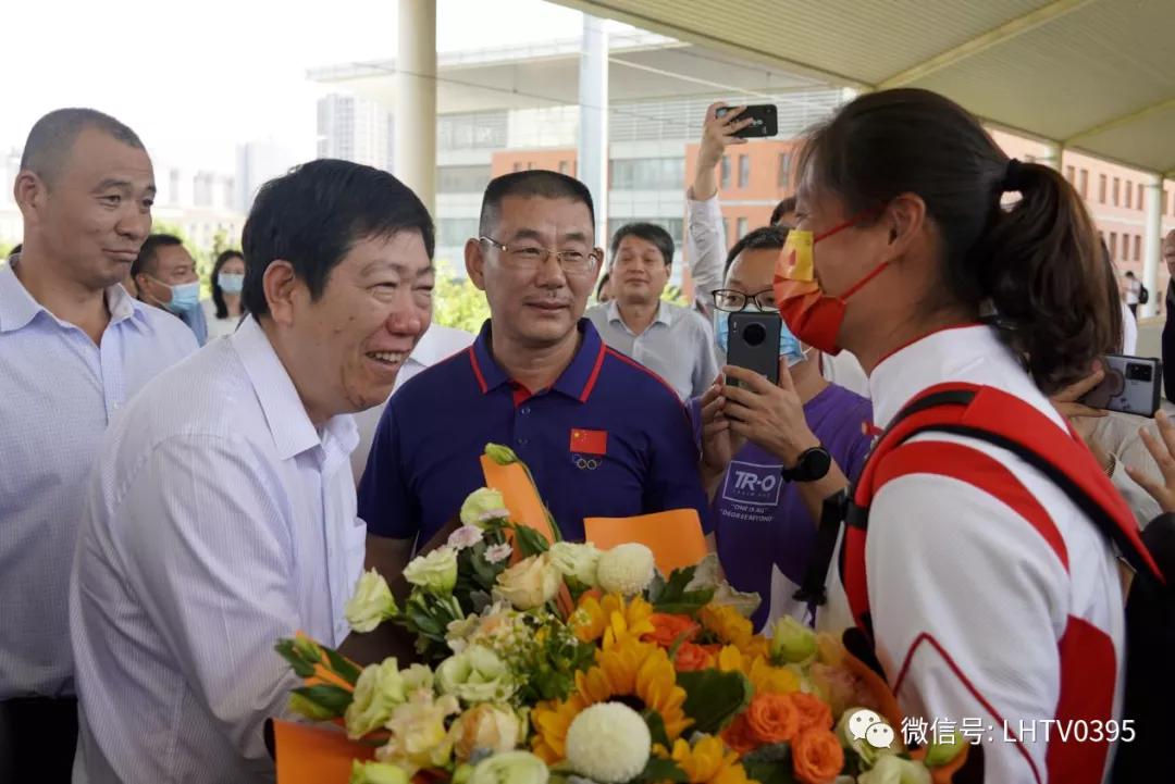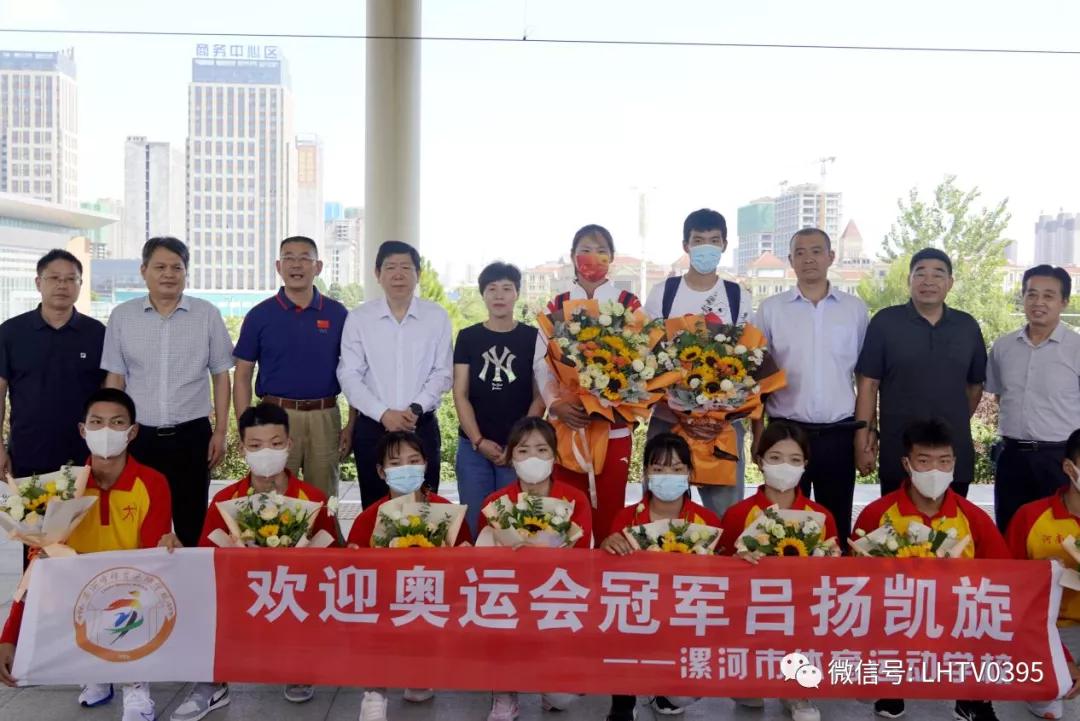 漯河市副市長栗社臣、呂揚父母、漯河市文化廣電和旅游局(體育局)黨組書記晁偉、局長張合良和市體校領(lǐng)導班子、師生代表,在漯河高鐵西站迎接奧運冠軍凱旋。