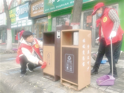 市區(qū)祁山路,志愿者擦垃圾桶。記者 于文博 攝