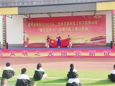 (記者 姚曉曉)“久有凌云志,重上井岡山。千里來尋故地,舊貌變新顏。到處鶯歌燕舞,更有潺潺流水,高路入云端……”3月2日下午,伴隨著學(xué)生們鏗鏘有力的朗誦聲,我市“做紅色傳人”文明實(shí)踐主題日宣傳活動在舞陽縣春雨國文學(xué)校拉開序幕(如圖)。