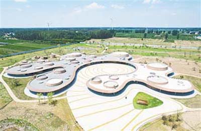 記者來(lái)到賈湖遺址博物館,映入眼簾的是古樸圓形建筑群。此建筑群整體外形像濺開(kāi)的水滴。陳列展區(qū)分為“禮樂(lè)之源”1個(gè)主題展廳和“賈湖探秘”“骨笛”“龜甲與符號(hào)”“墓葬與葬禮”4個(gè)專題展廳。每個(gè)展廳運(yùn)用人工智能、5G、MR、雷達(dá)投影互動(dòng)、3D動(dòng)畫等高新技術(shù),讓人們通過(guò)聲、光、電、影全方位感受賈湖文化的巨大魅力。