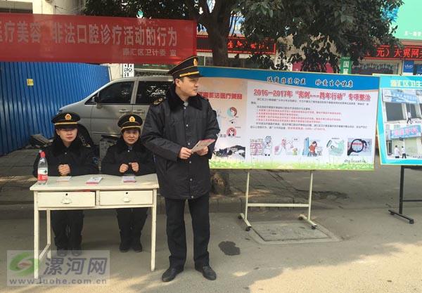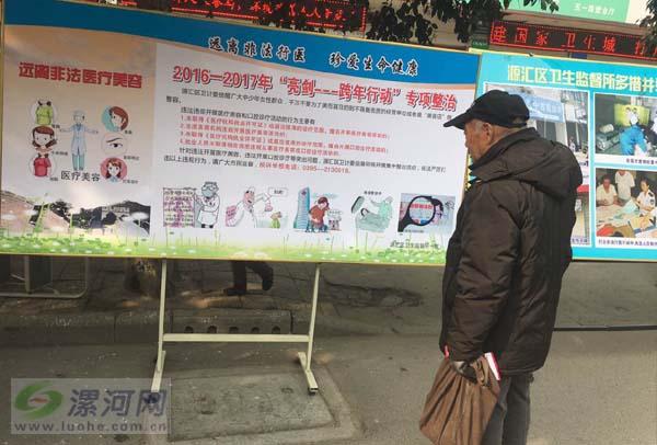 1月24日上午,源匯區(qū)衛(wèi)計委監(jiān)督所組織人員在五一路與人民路交叉口南100米處開展了“2016-2017年亮劍--跨年行動”宣傳工作,此次宣傳的主題是“嚴厲打擊非法醫(yī)療美容、非法口腔診療活動的行為”,違法違規(guī)開展醫(yī)療美容和口腔診療活動的行為主要有: