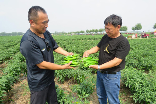 圖為石拐村黨支部書記、臨潁縣自安種植專業(yè)合作社負責人邢自安(右)石拐村第一書記張釗(左)在辣椒基地查看今年的辣椒長勢、辣椒品質(zhì)時的情景。