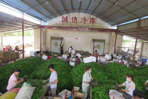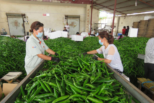 圖為臨潁縣王孟鎮(zhèn)石拐村自安產(chǎn)業(yè)扶貧基地的社員們,在冷庫為辣椒分揀、裝箱、冷藏時的情景。