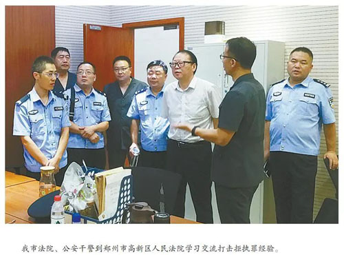 警務(wù)室成立以后,市中級人民法院黨組成員、副院長任國云牽頭組織成立了由執(zhí)行局、刑事法庭和公安民警共同參加的學(xué)習(xí)先進經(jīng)驗小組,分別到焦作市溫縣人民法院、商丘市柘城縣人民法院、鄭州市新密市人民法院等全國、全省執(zhí)行工作先進單位考察學(xué)習(xí),汲取打擊拒執(zhí)罪先進經(jīng)驗、對照工作找差距、彌補執(zhí)行短板,針對我市實際,制訂了一套“法院+公安”的協(xié)同作戰(zhàn)方案,并建立了信息共享、溝通反饋、組織協(xié)調(diào)、督辦檢查等執(zhí)行聯(lián)動工作機制。