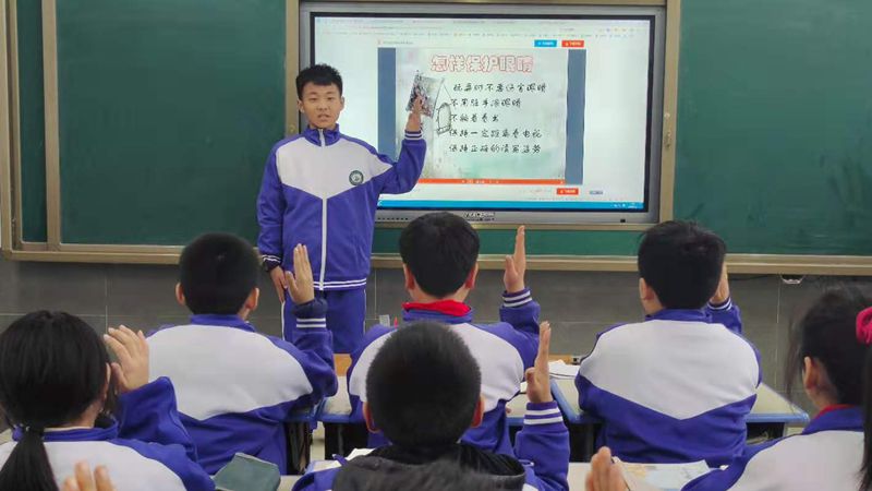 六二班學生任行在和班級同學交流保護眼睛的方法