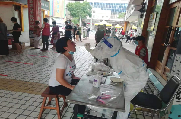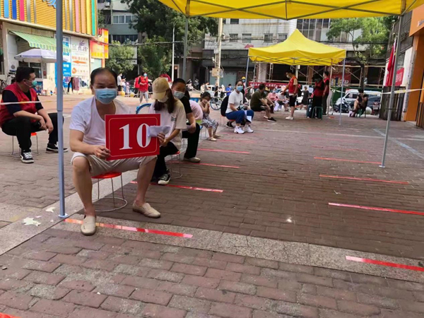 在各檢測點(diǎn)筆者看到,身穿紅馬甲的志愿者忙忙碌碌搞服務(wù),身穿防護(hù)服的醫(yī)護(hù)人員一絲不茍地在采集樣本,不時有各級領(lǐng)導(dǎo)、衛(wèi)健委的專家巡回開展工作指導(dǎo)。在長申玉檢測點(diǎn),把居民分小區(qū)、按樓棟組織參加檢測,嚴(yán)格做到間隔一米線,不扎堆,不聚集;馬路街辦事處14號檢測點(diǎn)在嚴(yán)格執(zhí)行一米線的同時,還提前對居民按照10人一組分組排號,有力提高了檢測效率,志愿者還幫助有困難的群眾看護(hù)孩子、開展信息登記等工作。