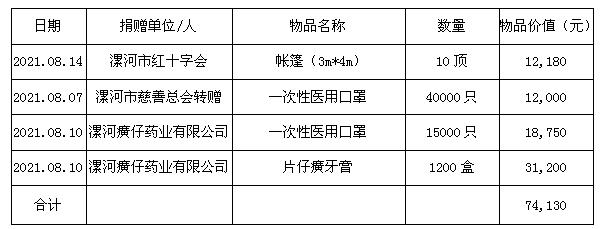 截止到8月16日20時(shí),漯河市新冠肺炎疫情防控指揮部累計(jì)收到社會(huì)捐贈(zèng)款物價(jià)值13,661,498.4元,其中捐贈(zèng)物資價(jià)值5,575,623.88元、捐贈(zèng)資金8,085,874.52元。本期捐贈(zèng)物資價(jià)值74,130元?,F(xiàn)將社會(huì)捐贈(zèng)情況公示如下:
