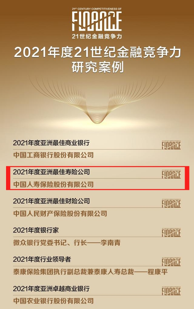 11月2日,第十六屆亞洲金融年會保險論壇在北京成功舉辦,21世紀(jì)亞洲金融競爭力研究案例同步揭曉。中國人壽保險股份有限公司(以下簡稱“中國人壽壽險公司”)榮獲“2021年度亞洲最佳壽險公司”大獎。