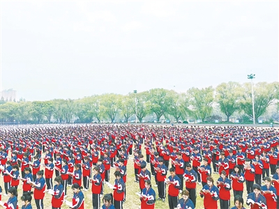 圖為漯河職業(yè)技術(shù)學(xué)院、漯河醫(yī)學(xué)高等專(zhuān)科學(xué)校的學(xué)生集體誦讀經(jīng)典篇章。