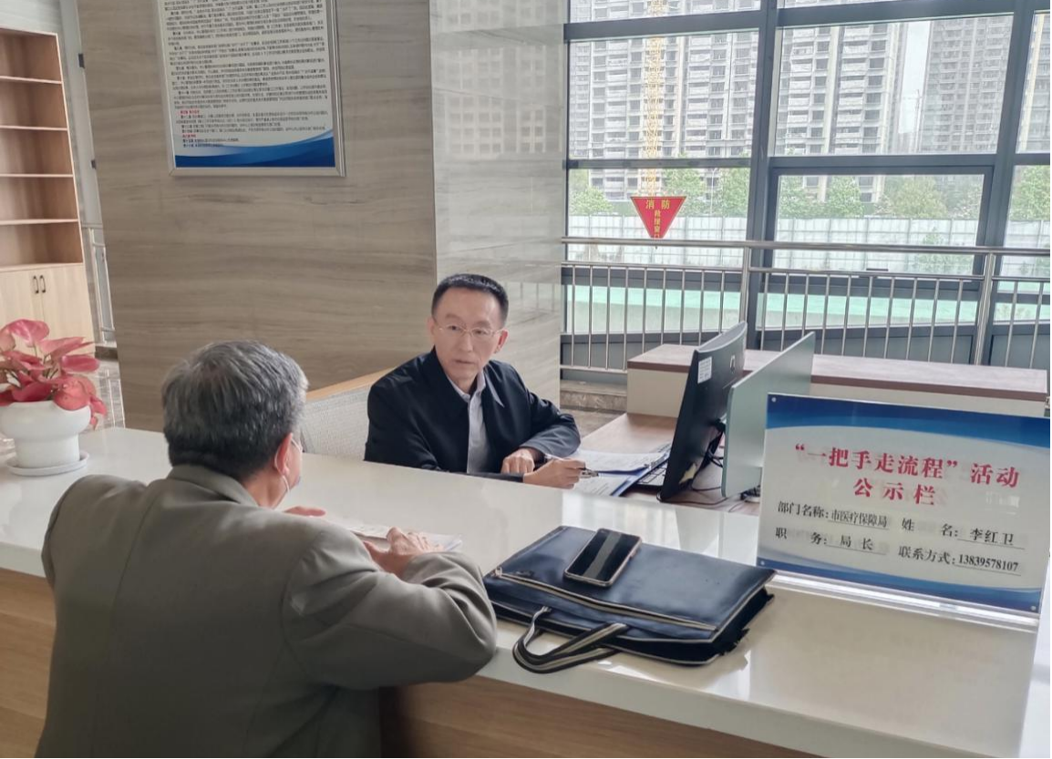 市醫(yī)療保障局局長(zhǎng)李紅衛(wèi)與市民一起辦理業(yè)務(wù)