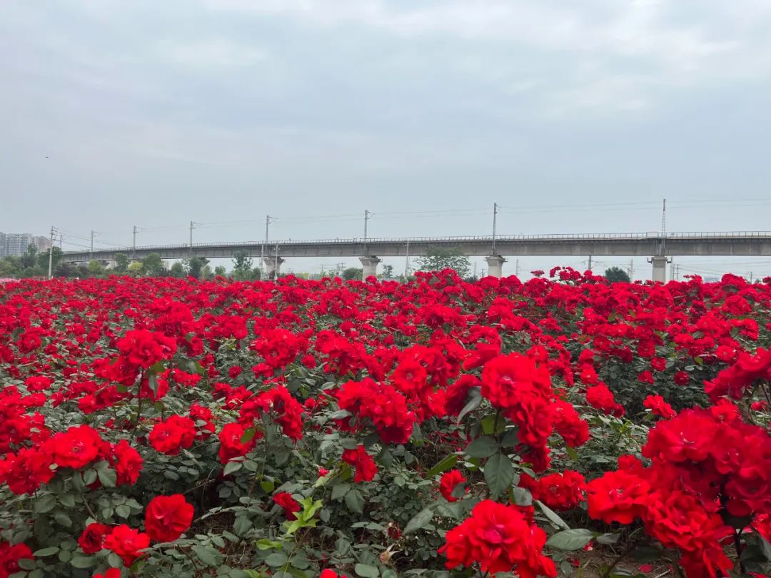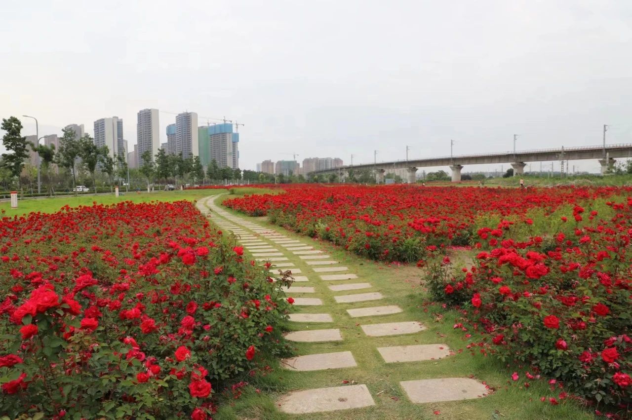 月季園內(nèi)以月季為主要品種,適當(dāng)配置刺玫、馬藺、蔥蘭、叢生福祿考、草坪等花卉及地被品種,營(yíng)造花海景觀;游園內(nèi)鋪設(shè)簡(jiǎn)易小型游步道,方便游人近距離賞景;靠近京廣鐵路一側(cè)種植夾竹桃進(jìn)行封擋,夾竹桃前側(cè)種植紅黃刺梅進(jìn)行安全隔離。