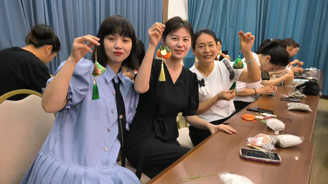 活動中,大家相互交流制作方法,從穿針引線到放香料、縫閉口、系吊繩,每一步都認真細致。隨著一雙雙巧手上下翻舞,一個個立體飽滿、精致美觀的香囊呈現(xiàn)在大家手上,細密針腳蘊含著心意,縷縷幽香寄托著祝福。