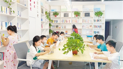 孩子們?cè)谠聻澈鐓^(qū)圖書(shū)閱覽室看書(shū)。