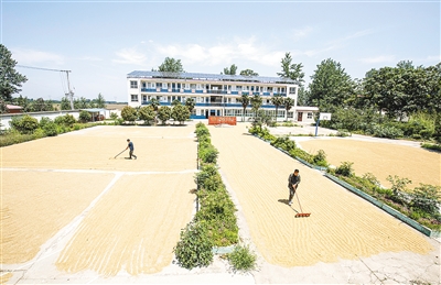 6月6日,我市天氣晴好,氣溫回升。群眾利用村文化廣場、學(xué)校操場、村內(nèi)道路等,晾曬收獲后的小麥。