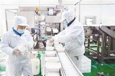 磨漿、煮漿、鋪漿、自動(dòng)起皮、仿手工搓條成型……在南街村清真食品有限公司鮮腐竹生產(chǎn)車間,生產(chǎn)線正緊張運(yùn)轉(zhuǎn),偌大的車間只看到兩三個(gè)工人。“速凍的鮮腐竹僅需幾分鐘解凍就可食用。”公司技術(shù)經(jīng)理任民告訴記者,目前該車間共有5條生產(chǎn)線,每天產(chǎn)出鮮腐竹2.5噸。除了鮮腐竹,該公司還生產(chǎn)豆腐腦、麻婆豆腐、豆干、千張等預(yù)制菜。