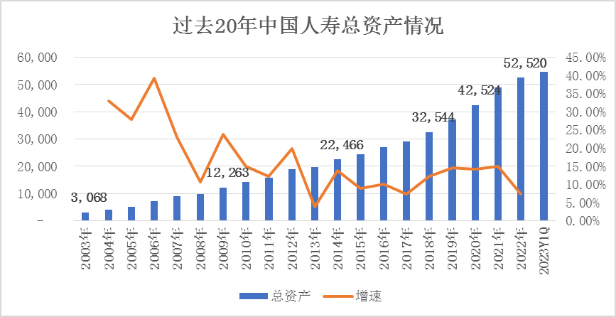保費規(guī)模的增長,也帶動著公司的資產規(guī)模迅速增長。經過20年的積累,國壽壽險2022年的總資產規(guī)模達到了5.25萬億元,成為我國首家資產規(guī)模突破5萬億的壽險公司,較2003年上市之初的3287億元增長了15倍。