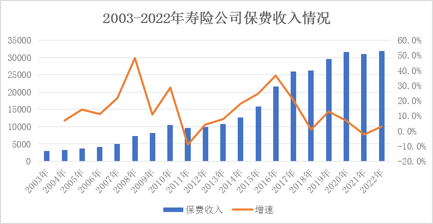剛剛過去的2022年,我國人身險公司保費收入達到了3.2萬億,而在2003年,人身險公司整體保費還不足3000億,過去20年,我國人身險公司保費規(guī)模增長了10倍,復合增長率超過了13%。在此期間,我國的GDP也從2003年的13.74萬億增長到2022年末的121.02萬億,復合增長率也超過了12%??梢钥闯?,過去20年,人身險公司的保費增長和GDP的增長基本吻合,這也符合人身險業(yè)務的發(fā)展規(guī)律。隨著國家經濟實力的增強,國民收入的提高,人們對保險的需求進入到了一個新的增長階段,也為國內的人身險公司送來了發(fā)展的東風。
