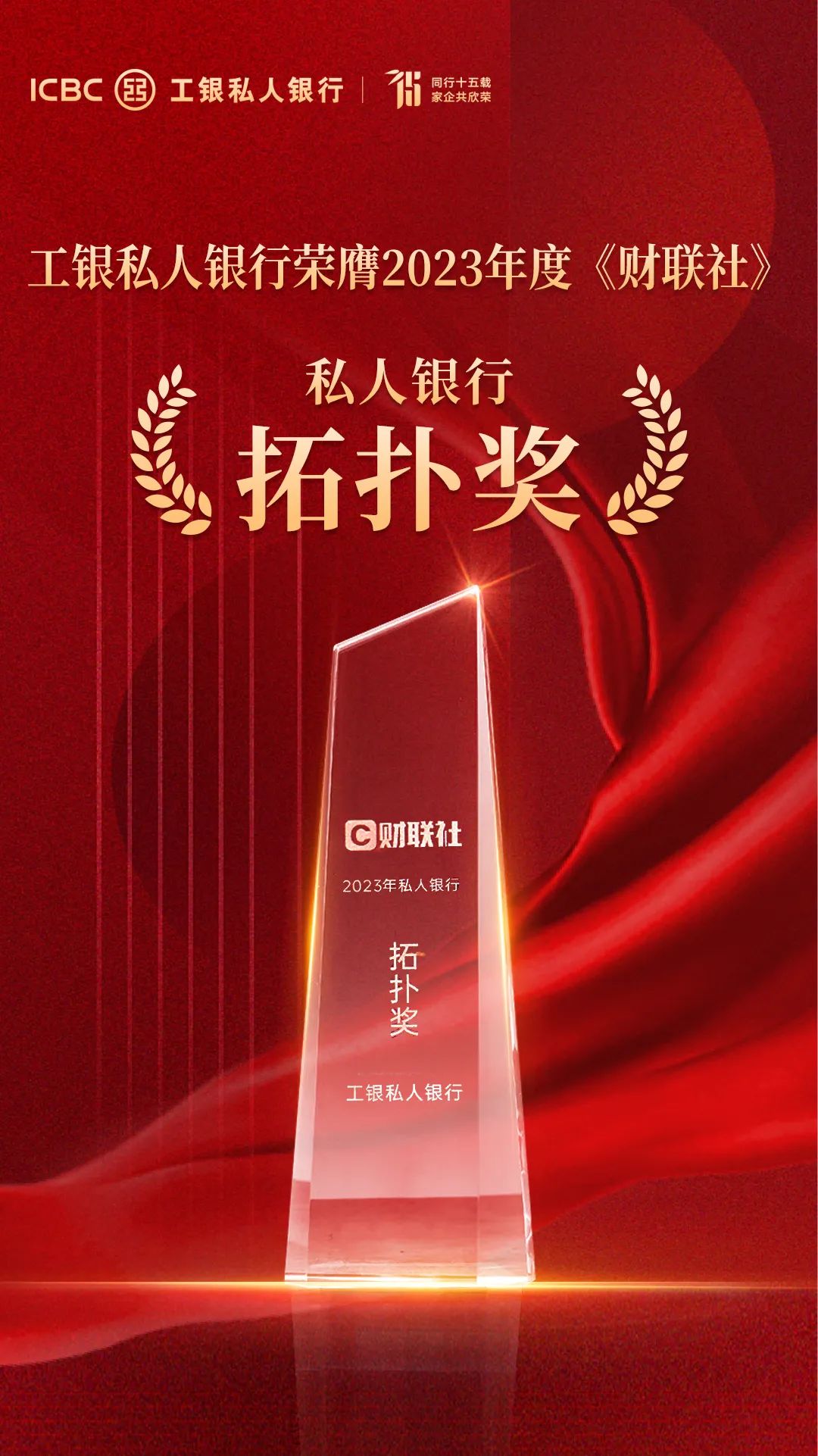 12月15日,在財(cái)聯(lián)社2023年度金融業(yè)年會(huì)頒獎(jiǎng)典禮上,工銀私人銀行憑借卓越的綜合創(chuàng)新能力榮膺2023年私人銀行“拓?fù)洫?jiǎng)”。