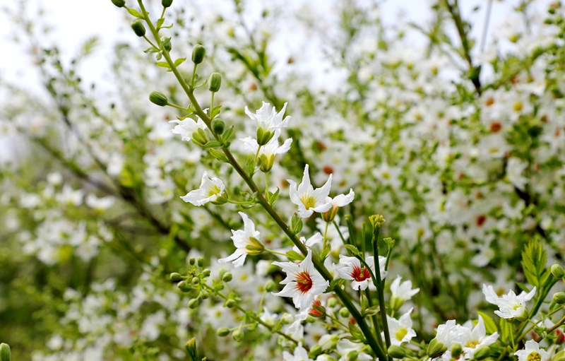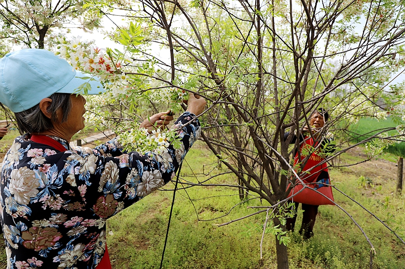 “橋張村以前是個古寨,這一渠清水是古寨外面的寨河,文冠果的種植基地就在寨河兩岸,7000多株文冠果為橋張村戴上了‘花環(huán)’。文冠樹上結(jié)的文冠果又叫龍果、龍瓜,可以榨油,葉子能泡茶,花中含有芩皮苷,有解熱、安眠的作用,不論是食用、藥用還是觀賞價值都很高,可以說全身都是寶。用文冠果葉子炒出的茶葉,口感香醇,市場價可賣到每公斤1000元以上。”4月7日,在舞陽縣九街鎮(zhèn)橋張村文冠果種植基地,該村村支部書記張軍輝介紹。