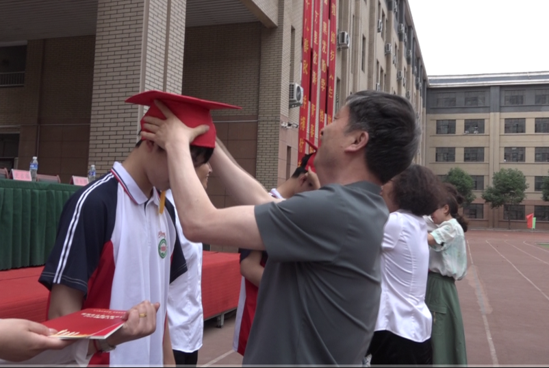 家長、老師為同學們戴成人帽,頒發(fā)成人證書。加冠笄,明責任,各位領(lǐng)導為學生代表撥動象征成年的帽穗,頒發(fā)《中華人民共和國憲法》讀本。同學們戴上象征成人的冠帽,手握《憲法》,展開對未來的美好憧憬與無限期盼。一頂頂成人禮帽,見證著每一位學子的長大成人。全體同學起立,和父母交換信件,向父母深深地鞠躬,一個個溫暖堅實的擁抱,一聲聲“爸、媽,我愛你”,讓在場的所有人為之動容,熱淚盈眶。
