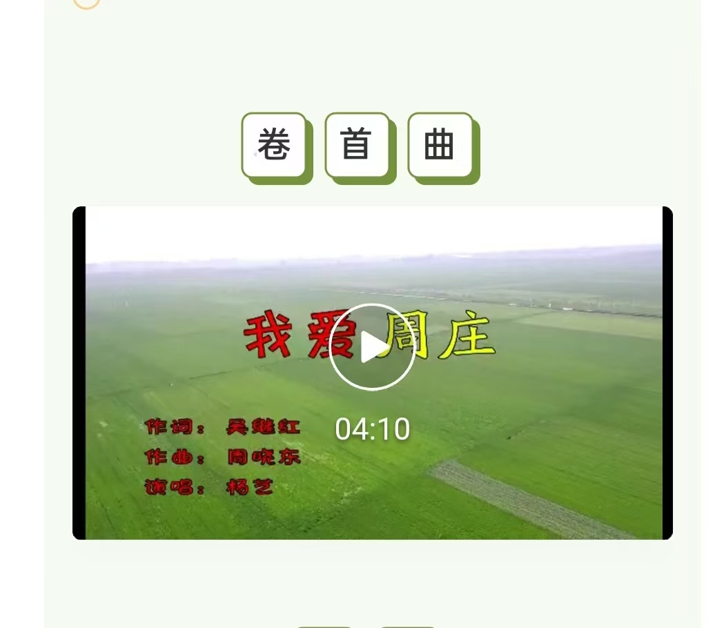 歌曲《我愛周莊》詞作者源匯區(qū)文化館吳繼紅,曲作者是原市音樂家協(xié)會主席周曉東,演唱者源匯區(qū)實驗學(xué)校音樂老師楊藝。歌曲融入鄉(xiāng)村特色,運用了中國民族調(diào)式,將周莊村的秀美風(fēng)光、村民勤勞勇敢的精神風(fēng)貌充分展現(xiàn)。歌詞富有詩意、旋律優(yōu)美,唱出了周莊村鄉(xiāng)村振興的美麗樂章,唱出了老百姓對當(dāng)下生活的滿足和對美好未來的期待,更唱響了周莊人的自豪感,凝聚了鄉(xiāng)情,成為鄉(xiāng)村文化的新符號。