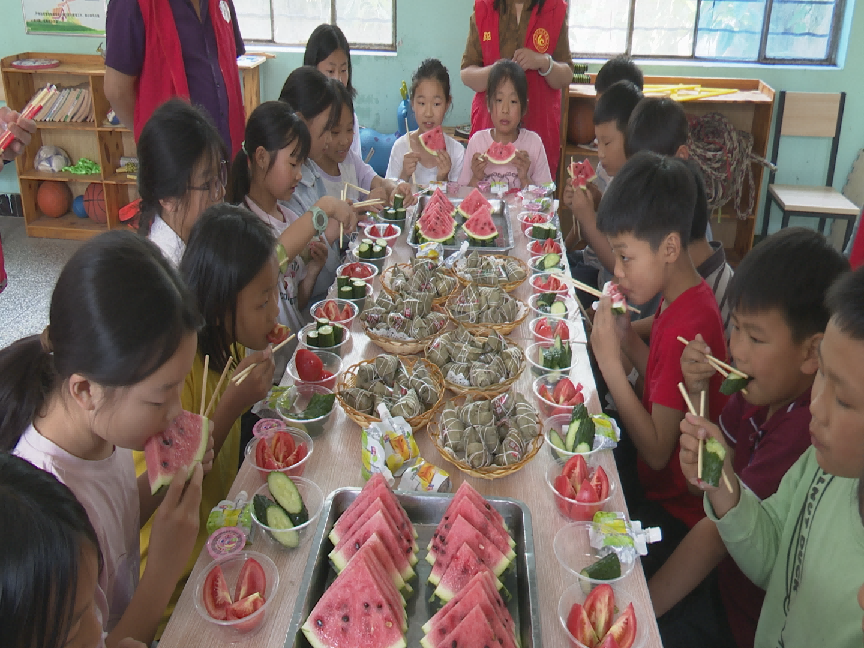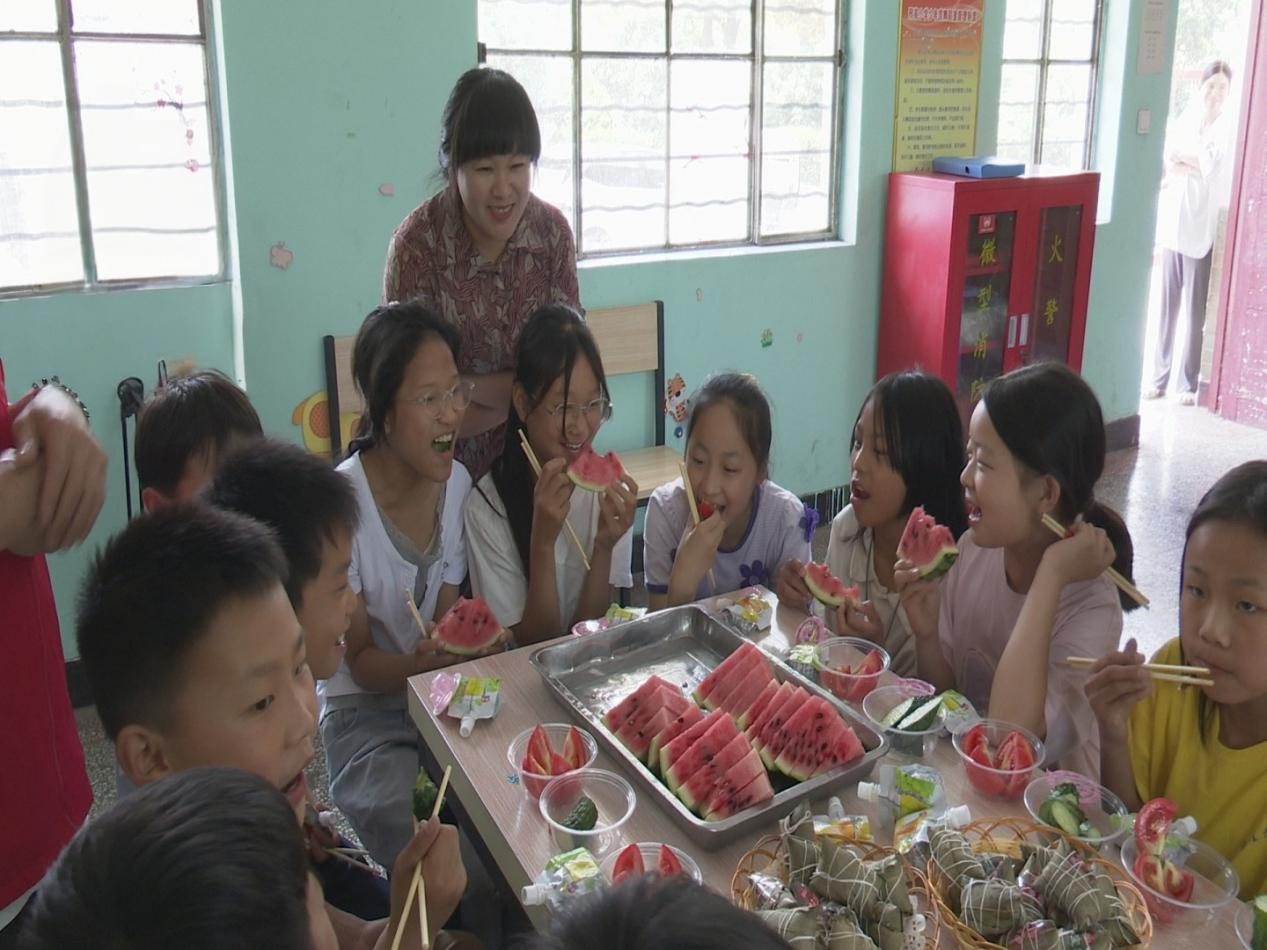 在三家店鎮(zhèn)高宗寨村兒童之家,鎮(zhèn)村干部們一早便忙活開來。他們精心準(zhǔn)備了粽子、果凍,將鎮(zhèn)內(nèi)特色農(nóng)產(chǎn)品西紅柿、黃瓜、西瓜洗凈切片,撒上白糖,制成飽含愛意的美食?;顒蝇F(xiàn)場,孩子們圍坐在一起,伴隨著稚嫩的童聲合唱《小星星》,品嘗著酸甜可口的西紅柿、清爽多汁的果蔬拼盤和軟糯香甜的粽子,歡聲笑語此起彼伏。"太好吃啦!紅紅的西紅柿、圓圓的大西瓜、脆脆的黃瓜,還有甜甜的粽子,比我以前吃過的都好吃!我太喜歡了",高宗寨小學(xué)學(xué)生宋夢凡開心地分享著感受。鎮(zhèn)村干部們一邊與孩子們品嘗美食,一邊親切詢問學(xué)習(xí)生活情況,用實際行動傳遞溫暖關(guān)懷。