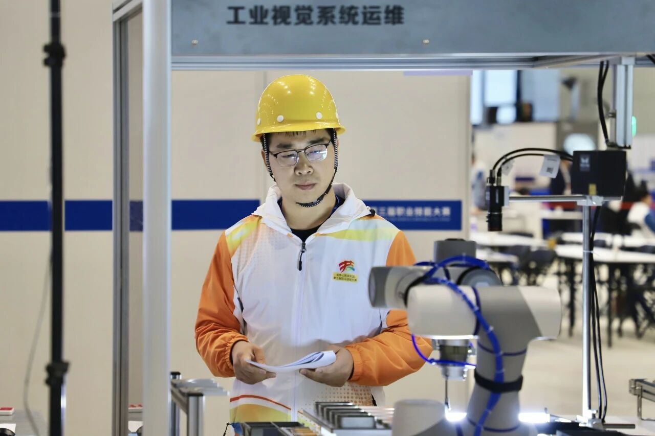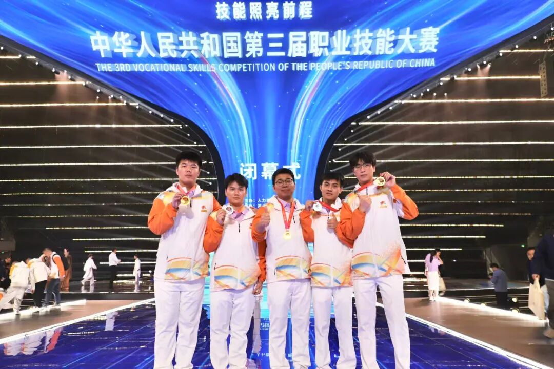 中華人民共和國第三屆職業(yè)技能大賽閉幕式上,自主移動機器人(世賽選拔項目)金牌獲得者楊奇瑞、介明鑫,工業(yè)視覺系統(tǒng)運維(國賽精選項目)金牌獲得者王華磊,機器人系統(tǒng)集成(世賽選拔項目)銀牌獲得者彎有道、王永康上臺領獎。