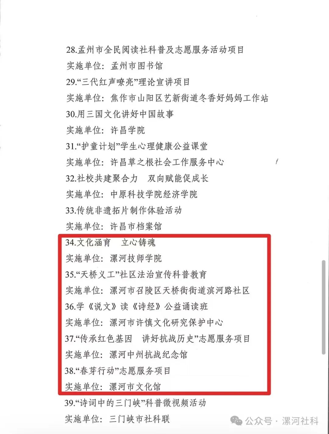 2024年表現(xiàn)突出社科普及志愿服務(wù)活動(dòng)項(xiàng)目(5個(gè)):文化涵育 立心鑄魂(實(shí)施單位:漯河技師學(xué)院);“天橋義工”社區(qū)法治宣傳科普教育(實(shí)施單位:漯河市召陵區(qū)天橋街街道濱河路社區(qū));學(xué)《說(shuō)文》讀《詩(shī)經(jīng)》公益誦讀班(實(shí)施單位:漯河市許慎文化研究保護(hù)中心);“傳承紅色基因 講好抗戰(zhàn)歷史”志愿服務(wù)項(xiàng)目(實(shí)施單位:漯河中州抗戰(zhàn)紀(jì)念館);“春芽行動(dòng)”志愿服務(wù)項(xiàng)目(實(shí)施單位:漯河市文化館)