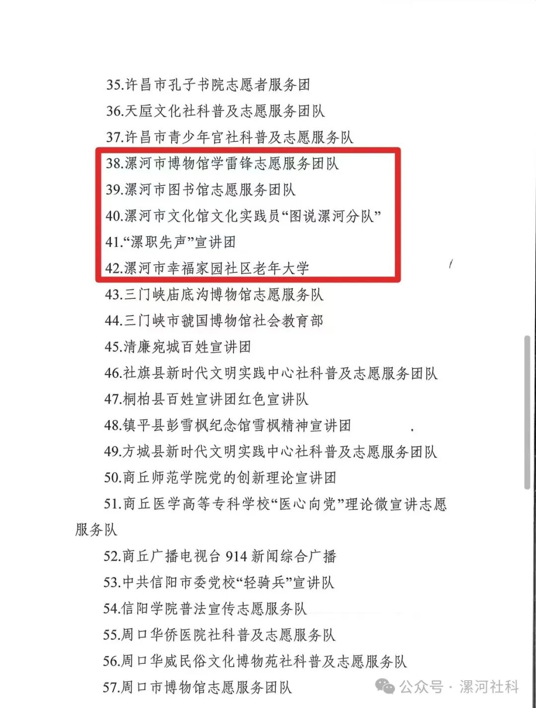 2024年社科普及志愿服務(wù)活動(dòng)表現(xiàn)突出社科普及志愿服務(wù)團(tuán)隊(duì)(5個(gè)):漯河市博物館學(xué)雷鋒志愿服務(wù)團(tuán)隊(duì);漯河市圖書館志愿服務(wù)團(tuán)隊(duì);漯河市文化館文化實(shí)踐員“圖說(shuō)漯河分隊(duì)”;“漯職先聲”宣講團(tuán);漯河市幸福家園社區(qū)老年大學(xué)