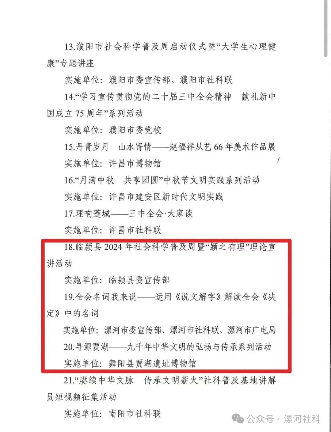 2024年河南省社科普及周活動(dòng)表現(xiàn)突出特色活動(dòng)(3個(gè)):臨潁縣2024年社會(huì)科學(xué)普及周暨“潁之有理”理論宣講活動(dòng)(實(shí)施單位:臨潁縣委宣傳部);全會(huì)名詞我來(lái)說(shuō)——運(yùn)用《說(shuō)文解字》解讀全會(huì)《決定》中的名詞(實(shí)施單位:漯河市委宣傳部、漯河市社科聯(lián)、漯河市廣電局);尋源賈湖——九千年中華文明的弘揚(yáng)與傳承系列活動(dòng)(實(shí)施單位:舞陽(yáng)縣賈湖遺址博物館)