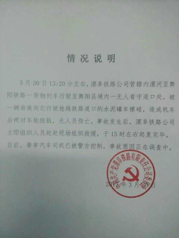 3月30日13:20分左右,漯阜鐵路公司管轄內(nèi)漯河至舞陽鐵路一貨物列車行駛至舞陽縣境內(nèi)一無人看守道口處,被一輛由南向北行駛搶越鐵路道口的水泥罐車擦碰,造成機(jī)車后兩對(duì)車輪脫軌,無人員傷亡。事故發(fā)生后,漯阜公司立即組織人員趕赴現(xiàn)場組織救援,于15時(shí)左右起復(fù)完畢。目前,肇事汽車司機(jī)已被警方控制,事故原因正在調(diào)查中。漯阜鐵路公司