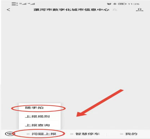 在公眾號主頁左下方點擊“問題上報”專欄,然后選擇“隨手拍”欄,按照規(guī)則提示進(jìn)行操作。