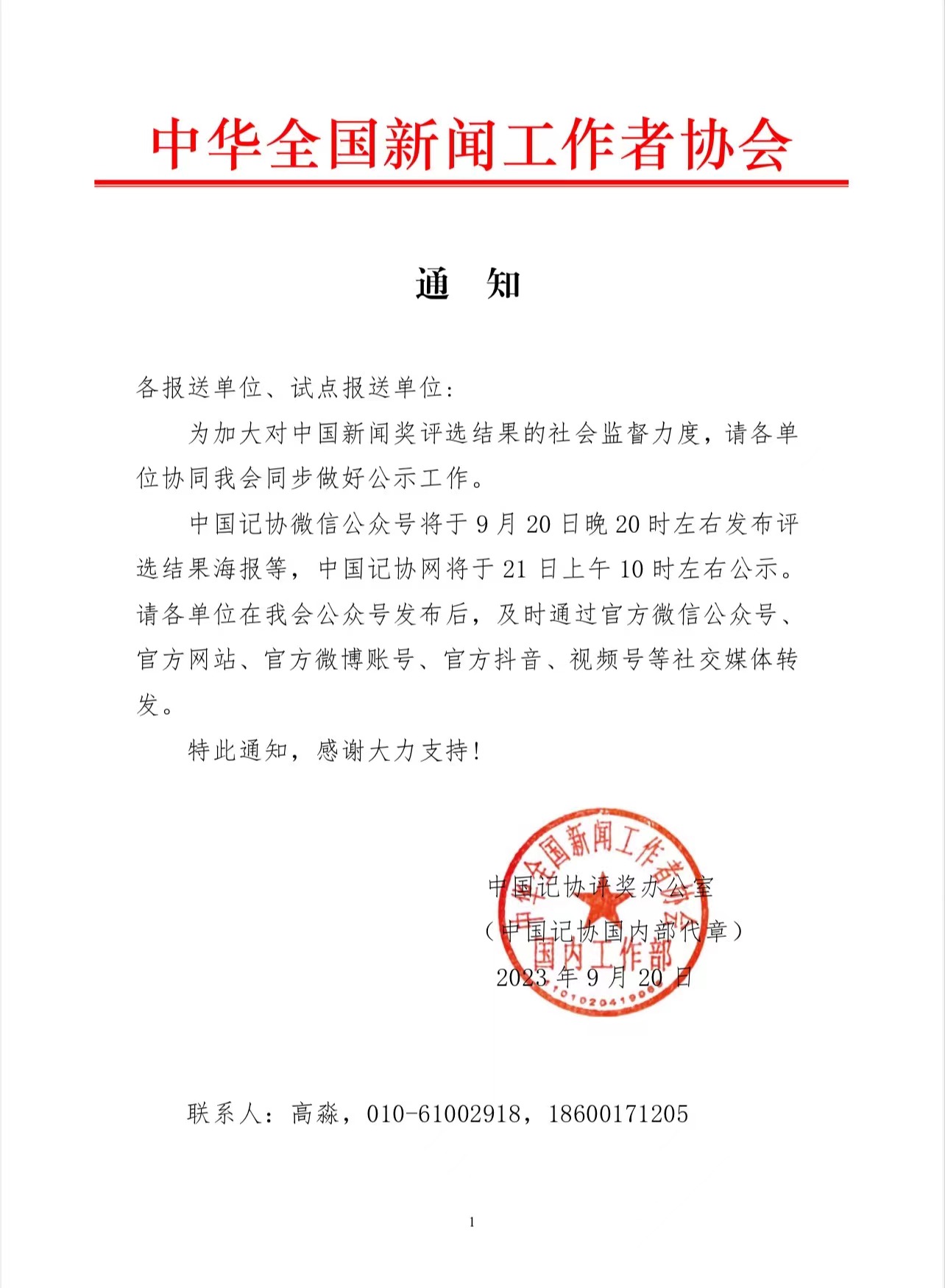 中華全國(guó)新聞工作者協(xié)會(huì)通知