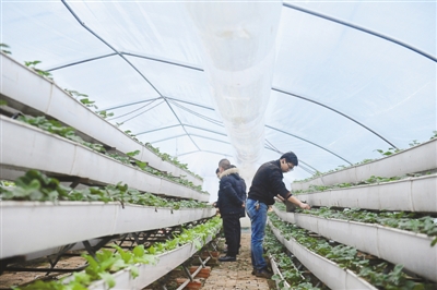 秸稈反應堆技術(shù)是源匯區(qū)食品安全監(jiān)督大隊在精準扶貧過程中幫助群眾引入的。王新華帶記者進入基地的塑料大棚,一入棚,排排立體種植的草莓就呈現(xiàn)眼前。舒展的草莓葉子充滿盈盈綠意,其間怒放著朵朵小白花。與一般的塑料大棚不同的是,草莓上面的棚架上固定有兩條塑料薄膜制成的“長龍”,里面充滿氣體。“長龍”貫穿大棚兩端,“龍身”上扎有一個一個的孔。王新華對記者說:“這兩條‘長龍’是送氣筒,里面是落葉經(jīng)秸稈反應堆技術(shù)處理后產(chǎn)生的二氧化碳氣體。”二氧化碳的氣源,是大棚一端的秸稈反應堆。正在忙著為秸稈反應堆打孔的陳小甫是大劉鎮(zhèn)前陳村村民,經(jīng)過一段時間的操作,他儼然成了秸稈反應堆技術(shù)方面的行家里手。“這一種是‘內(nèi)置秸稈生物反應堆’,其實就是把我們以前焚燒掉的玉米秸稈、樹葉等通過發(fā)酵,使它們轉(zhuǎn)化成蔬菜、瓜果所需要的二氧化碳。發(fā)酵過程中,還能為冬季蔬菜生長提供大量的熱量,促進蔬菜生長。使用秸稈生物反應堆技術(shù)后,可以不施化肥、不打農(nóng)藥,生產(chǎn)出來的瓜果蔬菜是典型的有機綠色食品。”