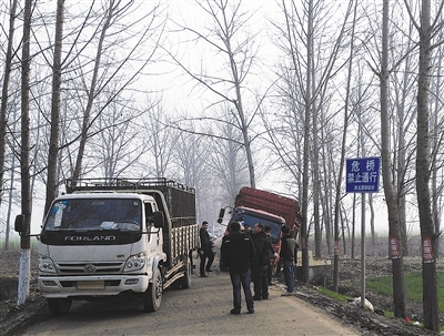 一座年久失修的危橋上設(shè)置了非常明顯的禁行標(biāo)志,但是貨車仍從橋上駛過(guò),不禁讓人揪心。這是記者1月8日在何冢路塔河橋上看到的一幕。