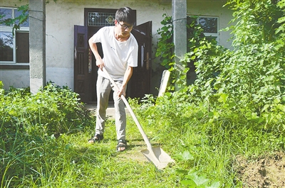 8月25日下午,記者走進舞陽縣孟寨鎮(zhèn)龍東村王帥斌的家中。院內(nèi)有一條通向堂屋的碎磚路,其他地方種了些蔬菜,剩余地方都是荒草。三間房屋經(jīng)過危房改造,房頂加固了彩鋼瓦。18歲的王帥斌正手握鐵鍬,鏟除小路上的雜草。