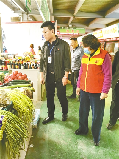 王斌(左)在遼河路一農(nóng)貿(mào)市場督查工作。