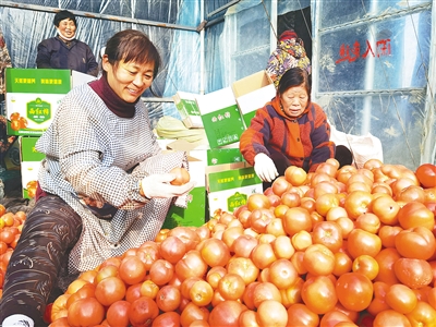 在宋莊村的田地里,記者見到整齊排列的六座溫室大棚,大棚外一輛輛小卡車來回穿梭,幾名村民或采摘新鮮西紅柿,或包裝成箱,或裝車外運,一派繁忙的勞動景象。
