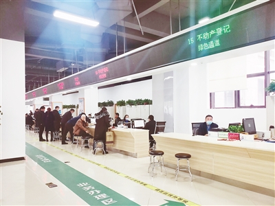 三樓大廳西南角的一個LED電子屏上,顯示著“不動產(chǎn)登記綠色通道”幾個字。