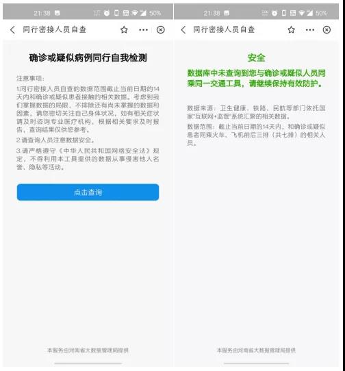 為了降低傳播風險,“豫事辦”針對疫情防控工作,推出了 疫情動態(tài)、患者同行查詢(快速查詢新冠肺炎確診患者同行程交通班次、到訪過的公共場所)、 同行密接人員自查(查詢是否與確診患者、疑似患者密切接觸,做好隔離工作)等功能,該功能數(shù)據(jù)由 國家衛(wèi)健委、鐵路、民航等部門提供,每日實時更新。
