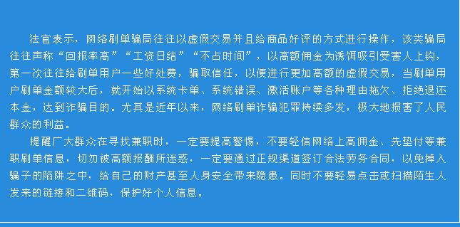 法官表示,網(wǎng)絡(luò)刷單騙局往往以虛假交易并且給商品好評(píng)的方式進(jìn)行操作,該類(lèi)騙局往往聲稱(chēng)“回報(bào)率高”“工資日結(jié)”“不占時(shí)間”,以高額傭金為誘餌吸引受害人上鉤,第一次往往給刷單用戶(hù)一些好處費(fèi),騙取信任,以便進(jìn)行更加高額的虛假交易,當(dāng)刷單用戶(hù)刷單金額較大后,就開(kāi)始以系統(tǒng)卡單、系統(tǒng)錯(cuò)誤、激活賬戶(hù)等各種理由拖欠、拒絕退還本金,達(dá)到詐騙目的。尤其是近年以來(lái),網(wǎng)絡(luò)刷單詐騙犯罪持續(xù)多發(fā),極大地?fù)p害了人民群眾的利益。