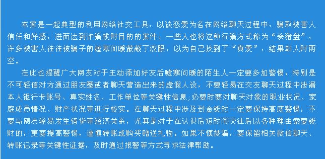 本案是一起典型的利用網(wǎng)絡(luò)社交工具,以談戀愛(ài)為名在網(wǎng)絡(luò)聊天過(guò)程中,騙取被害人信任和好感,進(jìn)而達(dá)到詐騙錢(qián)財(cái)目的的案件。一些人也將這種行騙方式稱(chēng)為“殺豬盤(pán)”,許多被害人往往被騙子的噓寒問(wèn)暖蒙蔽了雙眼,以為自己找到了“真愛(ài)”,結(jié)果卻人財(cái)兩空。