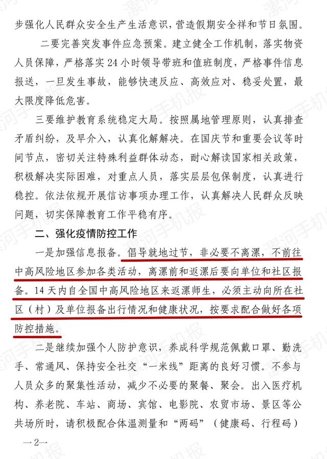 另外,記者了解到,根據疫情防控形勢和研判分析,我市對境外入境人員實行“14+7+7”管控措施。即:境外入境人員在第一入境地接受14天集中隔離后,到達我市閉環(huán)轉運至集中隔離場所,實行7天集中隔離,解除集中隔離后實施居家健康監(jiān)測7天,期間按照要求定期進行核酸檢測。中、高風險地區(qū)來漯返漯人員實行“14+7”管控措施。即:14天集中隔離醫(yī)學觀察解除后,再實施居家健康監(jiān)測7天,期間按照要求定期進行核酸檢測。