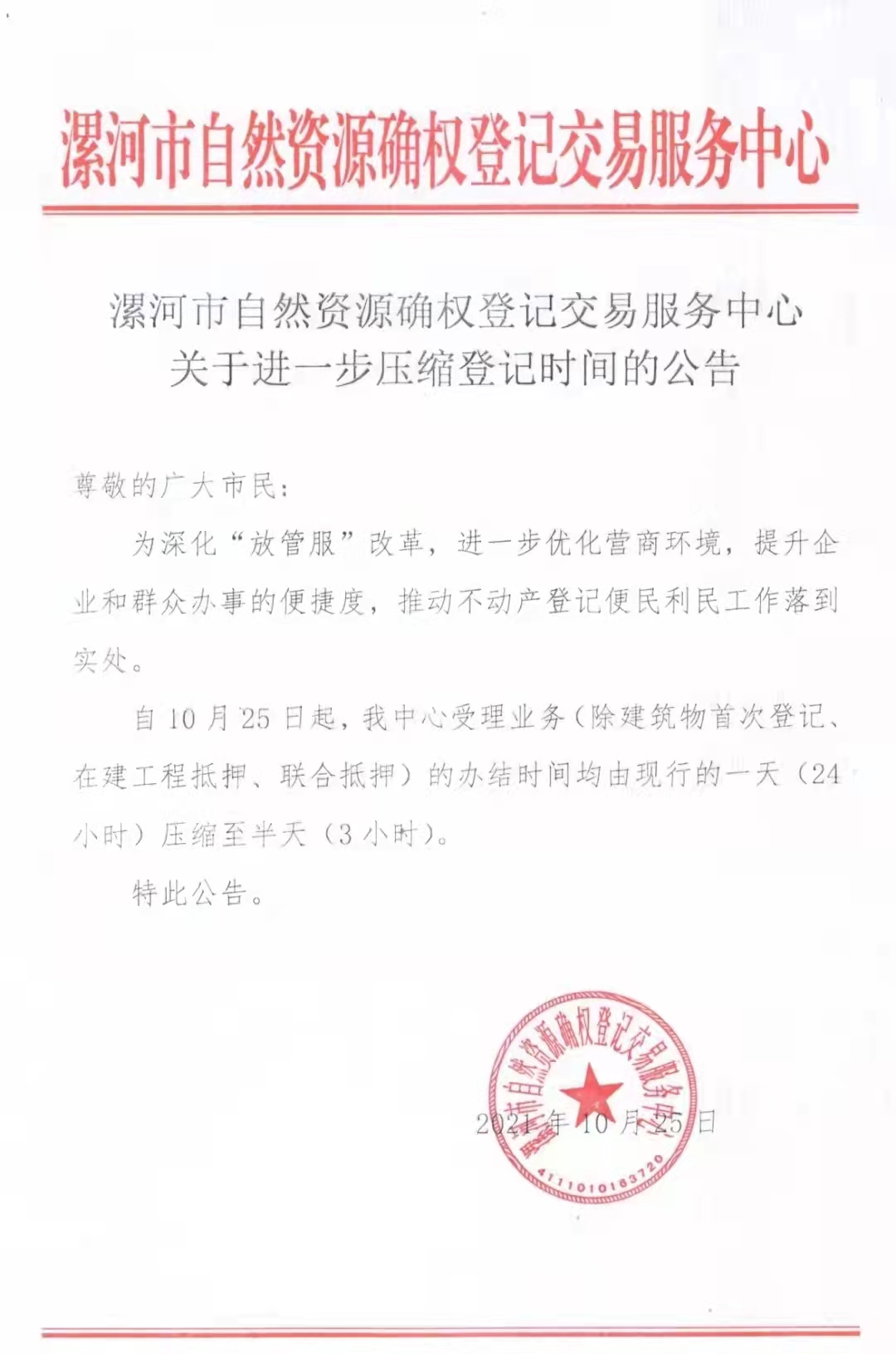 進(jìn)一步優(yōu)化營(yíng)商環(huán)境,提升不動(dòng)產(chǎn)登記各項(xiàng)指標(biāo),提高辦事效率和服務(wù)質(zhì)量,漯河市自然資源確權(quán)登記交易服務(wù)中心刀刃向內(nèi),持續(xù)推進(jìn)深化“放管服”改革,以提升服務(wù)能力作為工作的著力點(diǎn),以提高群眾滿意度為出發(fā)點(diǎn),主動(dòng)再次壓縮辦理時(shí)限,為企業(yè)和群眾提供更加高效、優(yōu)質(zhì)、滿意的服務(wù)。自10月25日起,受理業(yè)務(wù)(除建筑物首次登記、在建工程抵押、聯(lián)合抵押)的辦結(jié)時(shí)間均由現(xiàn)在的24小時(shí)壓縮至3小時(shí)辦結(jié)。(通訊員:李文豪  李苗苗)