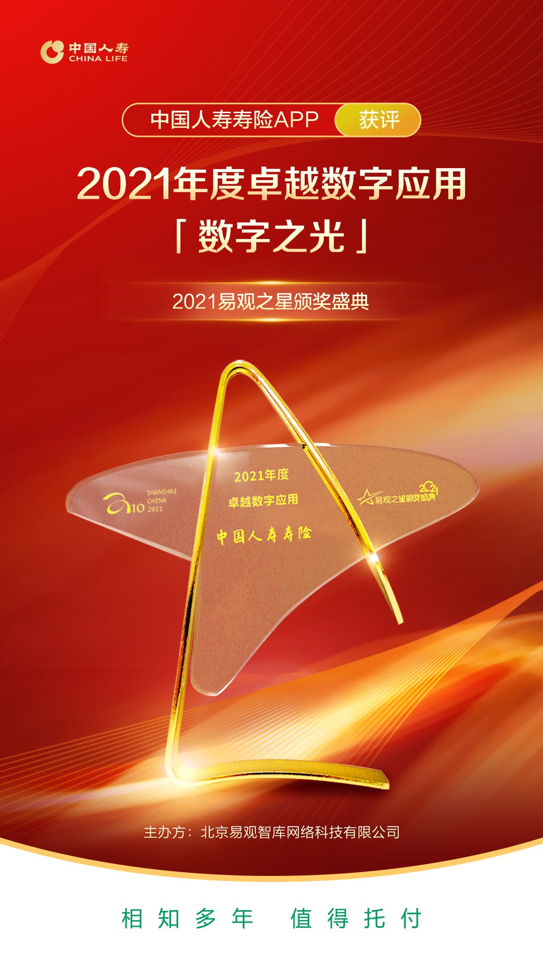 10月28日晚,“數(shù)字之光”2021易觀之星頒獎盛典隆重舉行。前期,組委會從第三方視角對參評企業(yè)在數(shù)字化升級進程中的競爭潛力、運營水平、投資價值以及用戶基礎(chǔ)等維度進行考察,綜合考量企業(yè)的數(shù)字化發(fā)展實力,并進行了排名。獎項用于表彰在數(shù)字經(jīng)濟蓬勃發(fā)展進程中守正出新的典范。中國人壽壽險APP(以下簡稱“壽險APP”)首次參與評選,最終榮獲“2021年度卓越數(shù)字應用”獎項。
