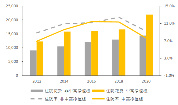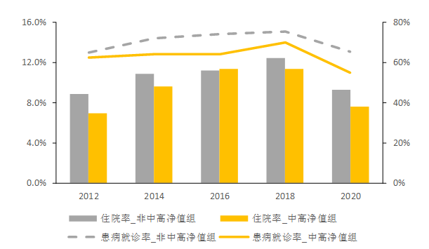 白皮書顯示,中高凈值人群的住院率和患病就診率均低于非中高凈值人群,醫(yī)療資源使用頻率偏低。與之相對(duì),中高凈值人群的住院費(fèi)用及年度家庭醫(yī)療總開支卻明顯更高,這意味著其在使用醫(yī)療服務(wù)資源時(shí)追求更高層次的服務(wù)需求。